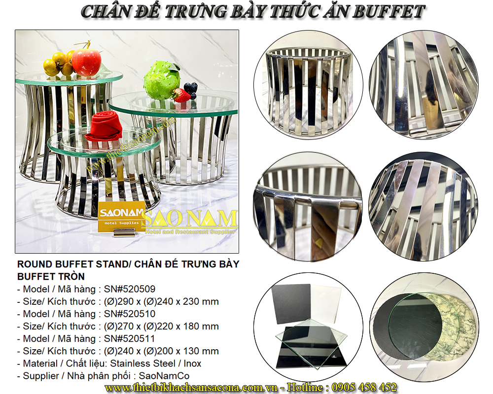 Chân Để Inox Décor SN#520509 là một bộ sưu tập gồm ba chân đỡ inox hình tròn với các kích thước giảm dần, tạo nên một hệ thống trình bày linh hoạt và có tính thẩm mỹ cao. Khác với những chiếc kệ đơn điệu, SN#520509 được sinh ra với triết lý “tầng lớp tạo nên sự phong phú”. Bộ ba này cho phép người sử dụng sắp xếp món ăn theo các cấp độ khác nhau, tạo ra một bố cục sống động, thu hút ánh nhìn và khiến thực khách muốn khám phá từng tầng một. Trong thế giới dụng cụ tiệc buffet, đây không chỉ là một phụ kiện hỗ trợ, mà là công cụ thiết yếu để kiến tạo nên một khu buffet đẹp mắt, chuyên nghiệp và đầy phong cách.