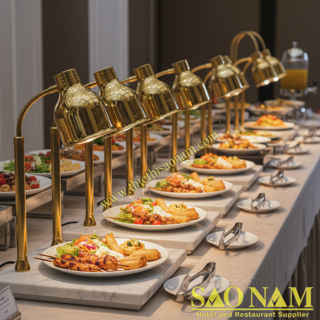 FOOD COVER WITH HEATING LAMPS/ ĐÈN HÂM NÓNG THỨC ĂN INOX VÀNG ĐẾ ĐÁ TRẮNG 2 BÓNG ( 2 BÓNG RỜI )