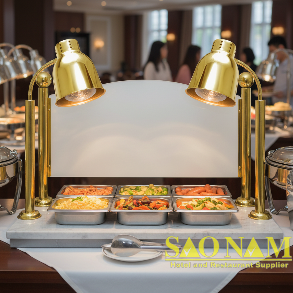 Trong ngành công nghiệp dịch vụ ăn uống đang phát triển không ngừng, hình thức tiệc buffet đã trở thành một phần không thể thiếu, từ các khách sạn 5 sao, nhà hàng cao cấp đến những sự kiện lớn. Thành công của một bữa tiệc buffet không chỉ nằm ở hương vị món ăn mà còn ở khả năng trình bày và duy trì chất lượng thức ăn theo thời gian. Trong bối cảnh đó, việc lựa chọn dụng cụ tiệc buffet thông minh, hiệu quả và có tính thẩm mỹ cao trở thành yếu tố then chốt. Và khi nói đến sự kết hợp tinh tế giữa vẻ đẹp sang trọng, khả năng giữ nhiệt ưu việt và độ bền vượt trội, Đèn Hâm Nóng Thức Ăn 2 Bóng Inox Vàng Mặt Đá Chữ Nhật Trắng SN#520816 chính là lựa chọn tối ưu, xứng đáng là trung tâm của mọi bàn tiệc buffet đẳng cấp.