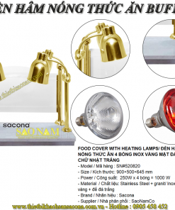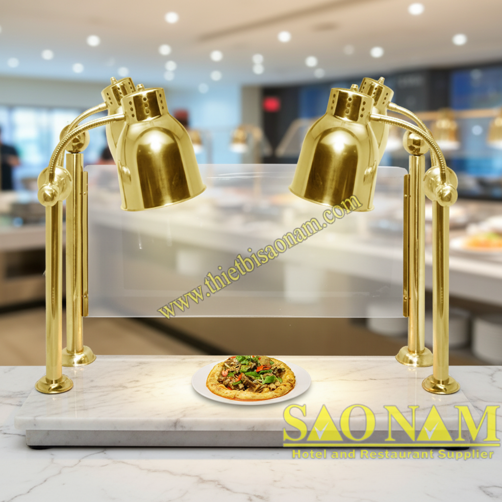 FOOD COVER WITH HEATING LAMPS/ ĐÈN HÂM NÓNG THỨC ĂN 4 BÓNG INOX VÀNG MẶT ĐÁ CHỮ NHẬT TRẮNG
