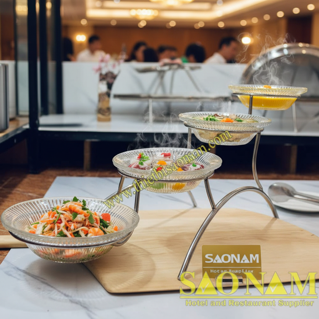 Tính Thẩm Mỹ Và Sang Trọng Vượt Trội: Thiết kế tinh xảo, với các tầng thủy tinh trong suốt lơ lửng trên khung inox sáng bóng, tạo nên một cấu trúc hiện đại, thanh lịch. Nó không chỉ đựng đồ mà còn là một phần của trang trí, góp phần nâng cao hình ảnh tổng thể của nhà hàng, khách sạn. Một bộ dụng cụ tiệc buffet đẹp chính là một lời quảng cáo trực quan về sự chuyên nghiệp và đầu tư của chủ đầu tư.