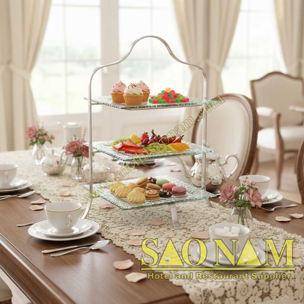 Giá Để Thức Ăn 3 Tầng SN#530255 xuất hiện như một sự thay đổi cần thiết. Trong khi các thiết kế tròn tạo cảm giác mềm mại, cổ điển, thì hình vuông lại mang đến sự chắc chắn, gọn gàng và hiệu quả về mặt không gian. Đây không đơn thuần là một lựa chọn thay thế, mà là một giải pháp thiết kế có chủ đích dành cho các nhà hàng, khách sạn muốn tạo điểm nhấn khác biệt và tối ưu hóa tuyệt đối diện tích bày biện.