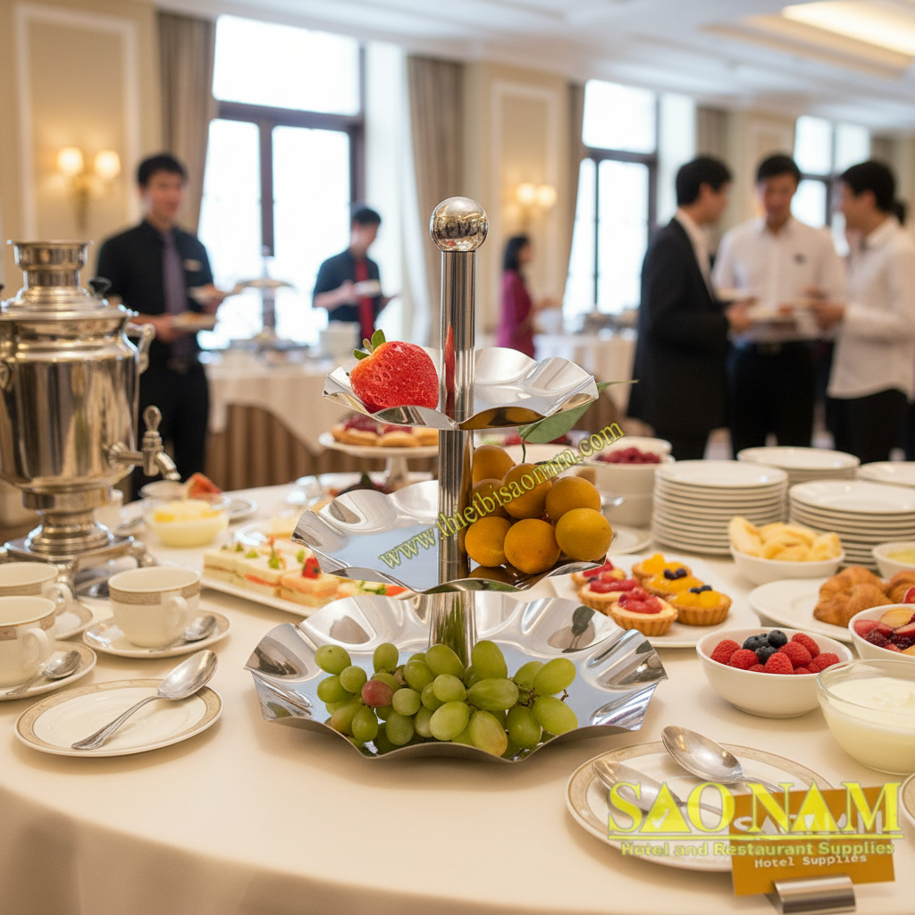 Tối Ưu Cho Dịch Vụ Tại Bàn (Table-Side Service) và Buffet Riêng Tư: Đối với các gói tiệc riêng tại phòng (private dining) hoặc dịch vụ phục vụ tại bàn, một giá 3 tầng nhỏ gọn như SN#520305 là lựa chọn lý tưởng. Nó có thể được đặt giữa bàn để mọi người cùng chia sẻ, tạo không khí thân mật, tiện lợi mà không chiếm nhiều diện tích bàn ăn.