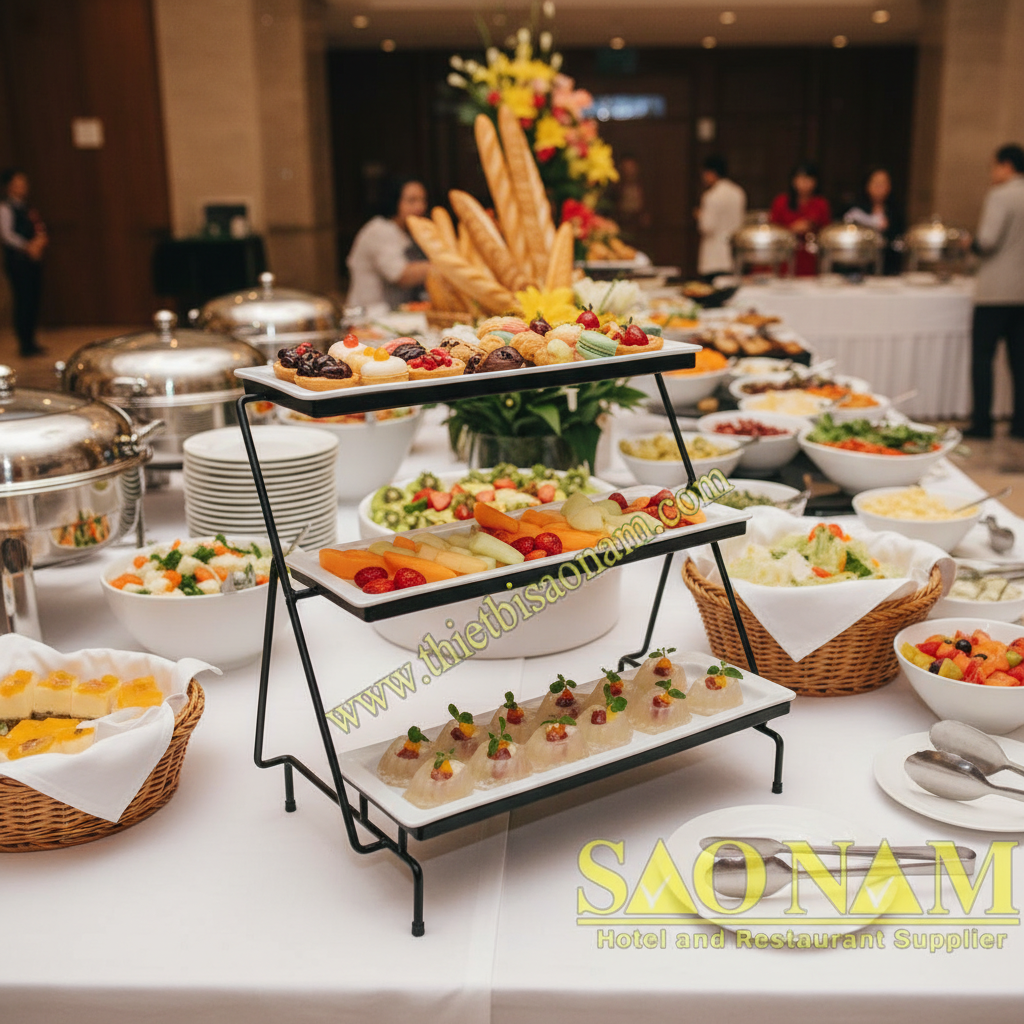 Điểm Cuối Của Hành Trình Buffet: Đặt ở cuối dãy bàn buffet, nơi thực khách gần như đã lấy đủ đồ chính. Kệ 3 tầng lúc này sẽ là một bất ngờ thú vị dành cho món tráng miệng, tạo cảm giác trọn vẹn cho bữa ăn.