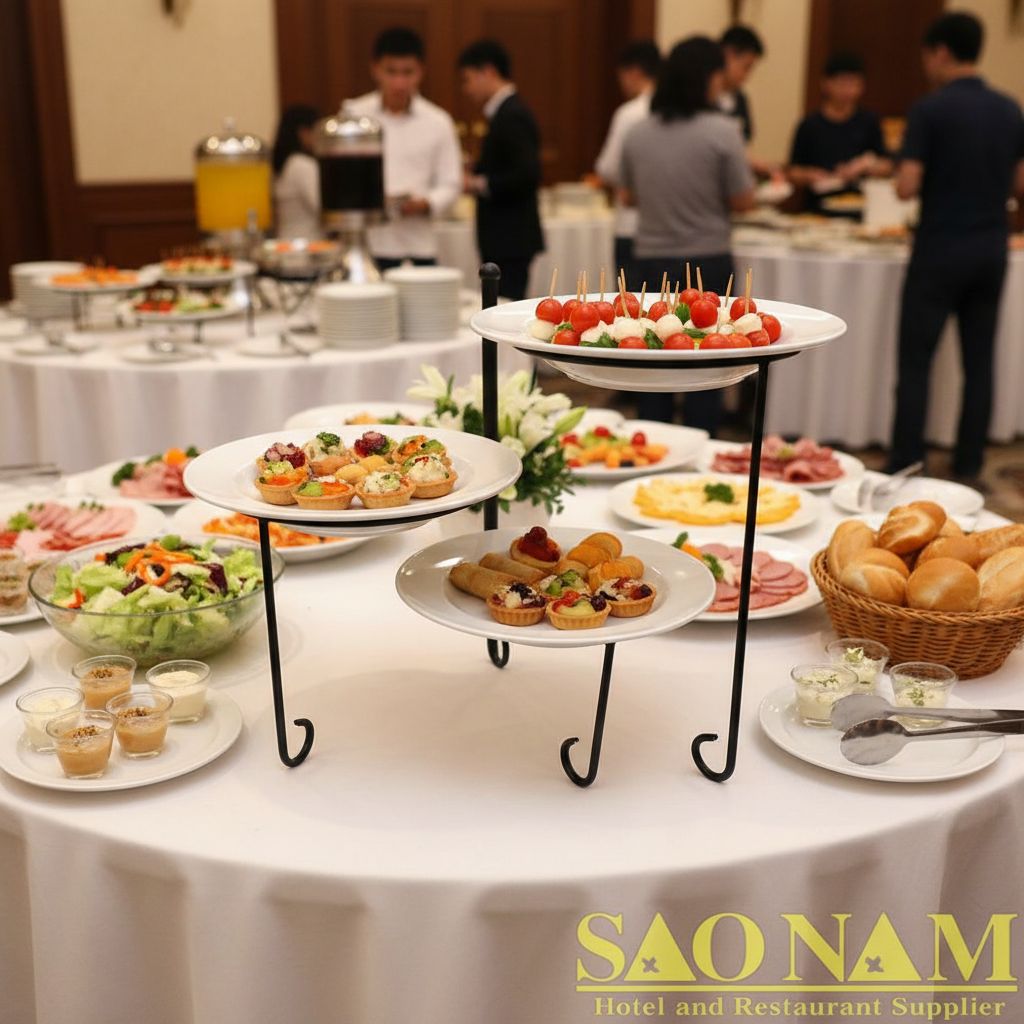 Trong thế giới của nghệ thuật ẩm thực trình bày, mỗi hình dạng đều mang một thông điệp thị giác riêng biệt. Nếu những đường thẳng và góc cạnh biểu trưng cho sự hiện đại và mạnh mẽ, thì vòng tròn luôn là biểu tượng của sự hoàn hảo, viên mãn và kết nối. Kệ Trưng Bày Thức Ăn 3 Tầng SN#530051 chính là sự hiện thân của triết lý hình học này trong lĩnh vực dụng cụ tiệc buffet. Với thiết kế độc đáo kết hợp giữa cấu trúc bậc thang năng động (105-155-410mm) và ba mặt đĩa tròn lớn đường kính 305mm, sản phẩm không chỉ là công cụ trưng bày mà còn là một tác phẩm điêu khắc hình học sống động. Sự kết hợp giữa khung sắt sơn tĩnh điện vững chãi và các đĩa Melamine đa sắc tạo nên một tổng thể vừa có cấu trúc rõ ràng, vừa mang lại khả năng biến hóa vô tận theo từng concept tiệc. Bài viết này sẽ dẫn dắt bạn khám phá mọi khía cạnh của SN#530051, từ triết lý thiết kế hình tròn đến những ứng dụng sáng tạo biến nó thành trái tim của mọi bàn tiệc buffet.
