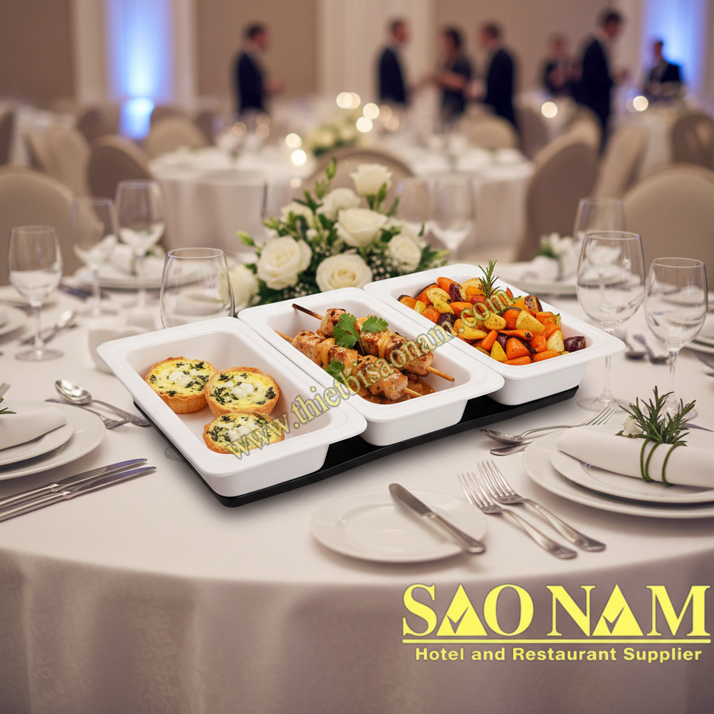 Sử dụng với tủ hâm nóng: Khay sứ rất thích hợp để đặt trong tủ hâm nóng buffet nhờ khả năng giữ nhiệt tuyệt vời.