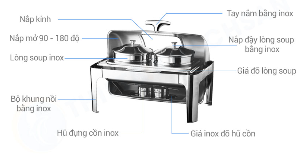 – Theo hình dạng : Nồi hâm Buffet tròn, Nồi hâm Buffet chữ nhật, Nồi hâm Buffet hình vuông.