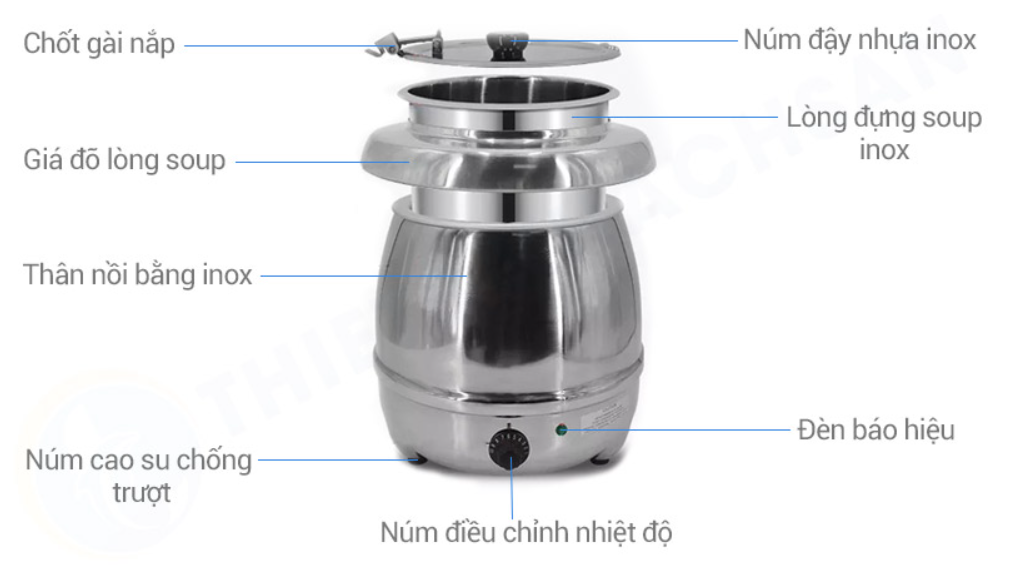 Nồi Hâm Cháo – Soup Dùng Điện SN#520050 được thiết kế lắp ráp từ nhiều bộ phận khác nhau. Gồm nắp đậy inox núm nhựa đen, giá đỡ lòng soup, lòng soup, thân nồi (dây điện theo nồi).