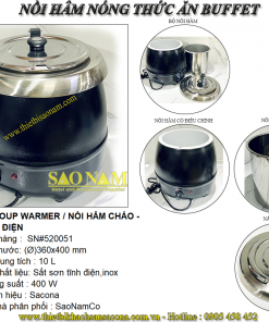 Nồi Hâm Cháo – Soup Dùng Điện SN#520051 là sản phẩm giúp giữ thức ăn luôn nóng từ đầu buổi tiệc đến cuối tiệc giúp hâm nóng món ăn giữ trọn hương vị ban đầu. Với dung tích 10 lít thông thường dòng nồi này được sử dụng cho các món như : soup, cháo, canh.