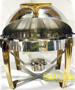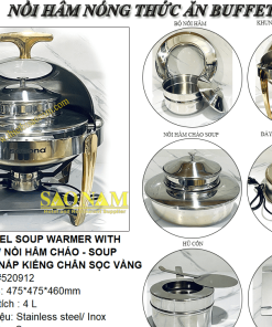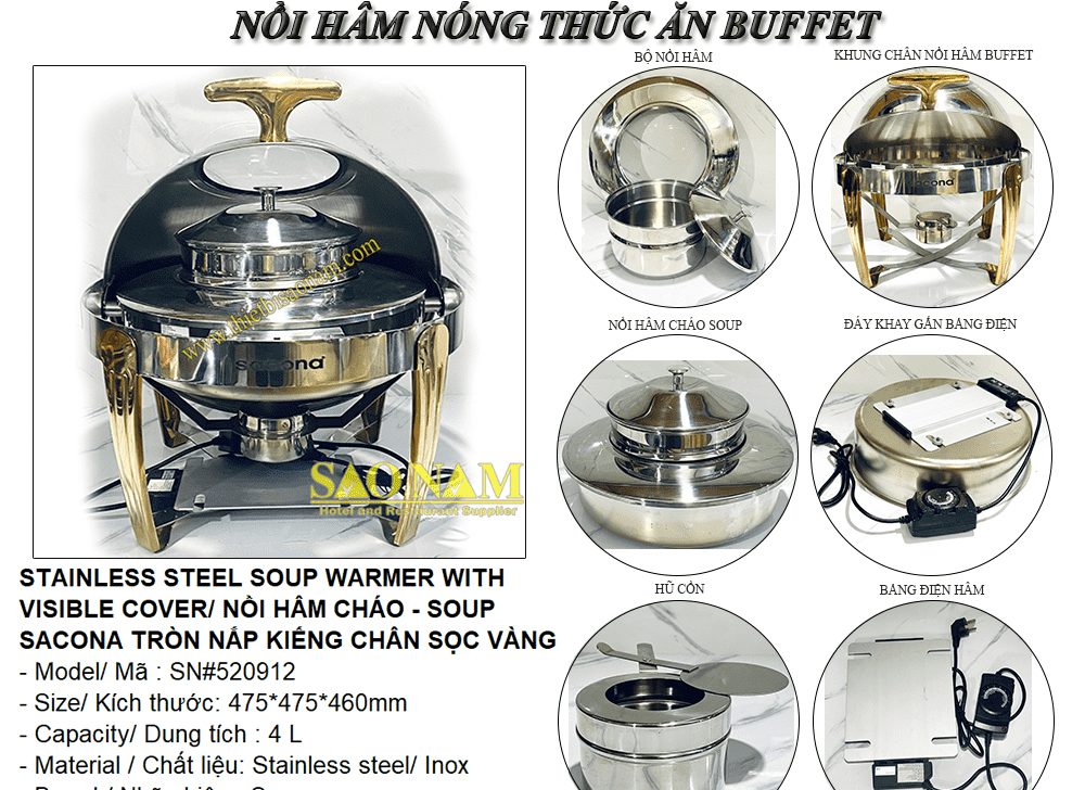 STAINLESS STEEL SOUP WARMER WITH VISIBLE COVER/ NỒI HÂM CHÁO – SOUP SACONA TRÒN NẮP KIẾNG CHÂN SỌC VÀNG