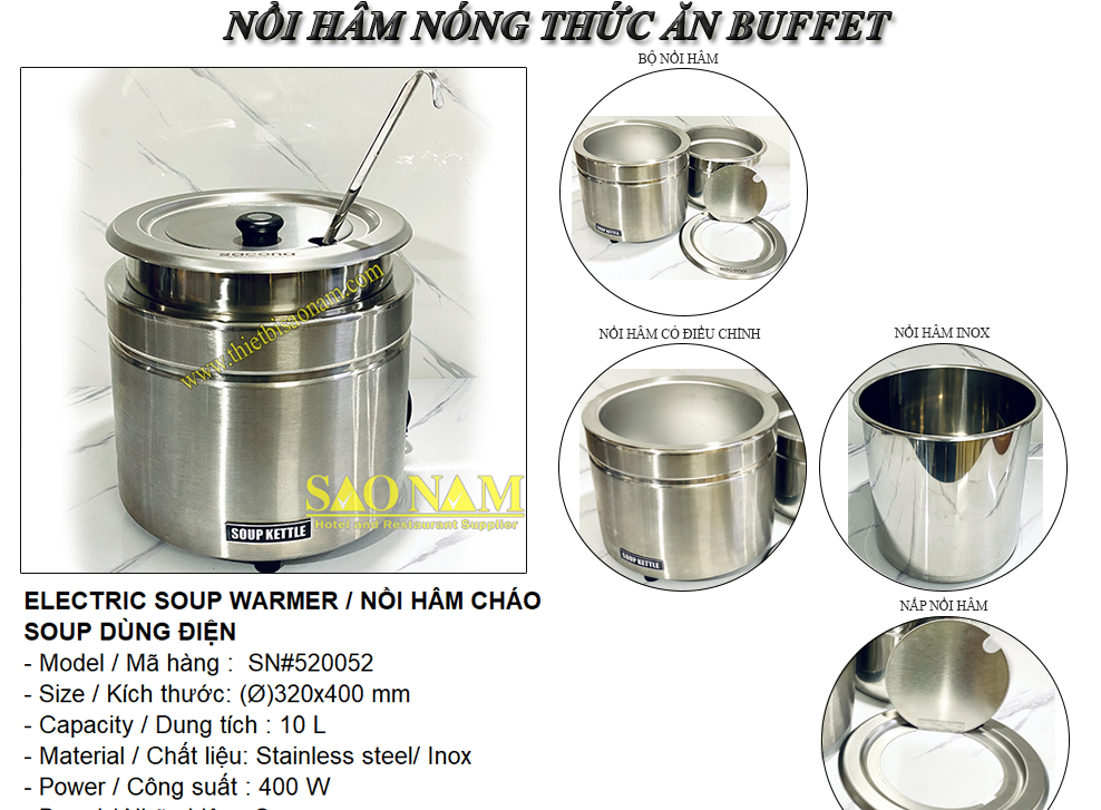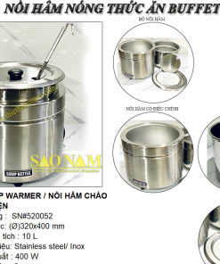 Nồi Hâm Cháo – Soup Dùng Điện SN#520052 là sản phẩm giúp giữ thức ăn luôn nóng từ đầu buổi tiệc đến cuối tiệc giúp hâm nóng món ăn giữ trọn hương vị ban đầu. Với dung tích 11 lít thông thường dòng nồi này được sử dụng cho các món như: Soup, cháo, canh, lẩu, lagu.