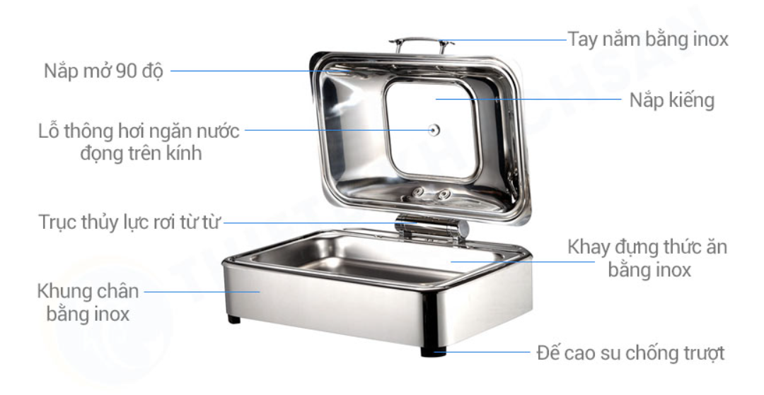 Thân Nồi Hâm (Nồi Hâm): Được chế tạo từ inox nguyên khối, có độ dày đảm bảo khả năng giữ nhiệt tốt. Thiết kế hình chữ nhật giúp tối ưu diện tích bề mặt tiếp xúc, cho phép nhiệt phân bổ đều khắp đáy khay.
