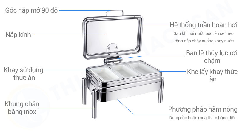 Nắp Kính Trong Suốt – Tôn Vinh Vẻ Đẹp Ẩm Thực: Nắp kính không chỉ có nhiệm vụ giữ nhiệt. Nó như một “tấm kính trưng bày”, cho phép thực khách chiêm ngưỡng vẻ đẹp và màu sắc của món ăn bên trong, kích thích vị giác ngay từ cái nhìn đầu tiên. Việc quan sát được lượng thức ăn còn lại giúp nhân viên kịp thời bổ sung, đảm bảo dịch vụ liên tục.
