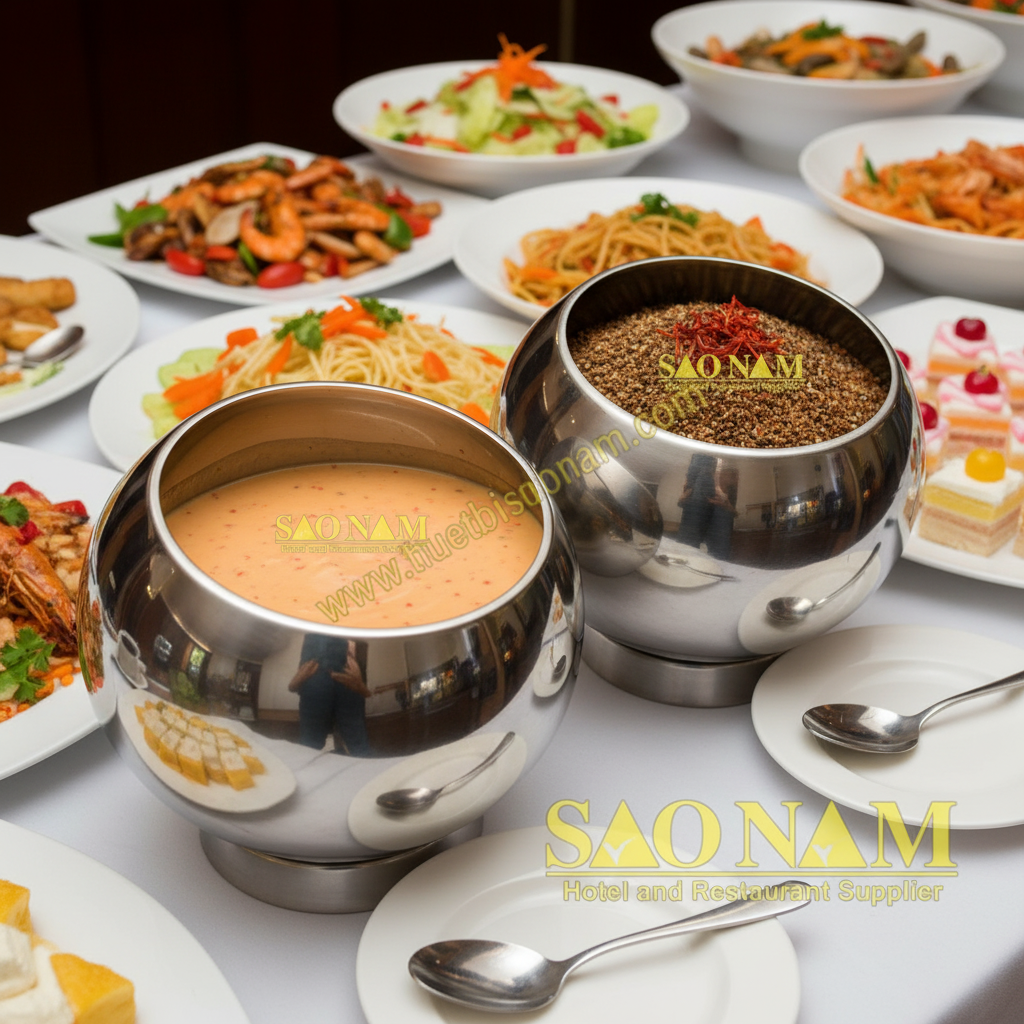 Tính Thẩm Mỹ Tinh Tế và Hiện Đại: Vẻ ngoài sáng bóng, đơn giản nhưng tinh tế của tô inox phù hợp với mọi phong cách thiết kế, từ cổ điển sang trọng đến tối giản hiện đại, dễ dàng kết hợp với các loại dụng cụ tiệc buffet khác.