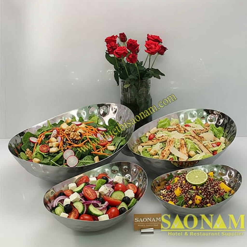 Trong nghệ thuật tổ chức tiệc buffet, mỗi chi tiết từ hương vị, không gian đến cách bài trí đều phải hòa quyện để tạo nên một tổng thể hoàn hảo. Ở đó, dụng cụ tiệc buffet không chỉ đơn giản là vật đựng, mà còn là “người dẫn chuyện” tinh tế, giúp kể câu chuyện về ẩm thực và sự đón tiếp chu đáo. Trong vai trò then chốt ấy, bộ sưu tập Tô Inox Oval Trưng Bày Buffet Chân Tròn với các mã sản phẩm từ SN#520146 đến SN#520149 của SaoNamCo xuất hiện như một bộ tiêu chuẩn vàng, kết hợp vẻ đẹp hình elo-gan với sự tiện dụng vượt trội, được thiết kế riêng cho những không gian ẩm thực đẳng cấp tại khách sạn, nhà hàng và quán ăn.