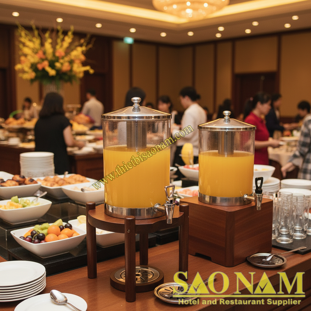 Với sự phân phối chính hãng từ SaoNamCo – đơn vị uy tín hàng đầu trong lĩnh vực cung cấp thiết bị nhà hàng, khách sạn tại Việt Nam – quý khách hàng hoàn toàn yên tâm về chất lượng sản phẩm, chế độ bảo hành và dịch vụ hậu mãi chu đáo. Hãy liên hệ ngay với SaoNamCo để được tư vấn chi tiết và sở hữu bộ đôi bình đựng nước trái cây chân gỗ – vẻ đẹp tự nhiên cho mọi không gian buffet!4