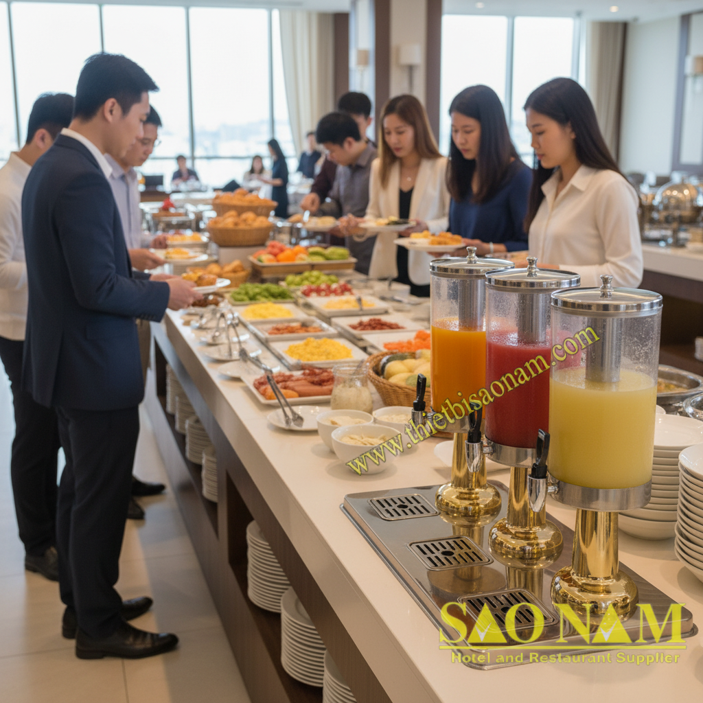 Đây là ứng dụng xứng tầm nhất. Tại các khách sạn cao cấp, khu vực buffet sáng luôn được chăm chút tỉ mỉ. Bình đựng nước trái cây chân mạ vàng với vẻ đẹp quý phái sẽ là điểm nhấn hoàn hảo cho khu vực đồ uống. Bình 2-3 ngăn cho phép phục vụ đa dạng nước ép nhiệt đới, đáp ứng nhu cầu của du khách quốc tế.