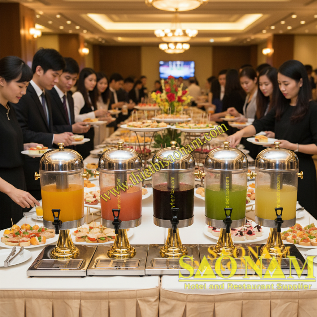 Đây là ứng dụng xứng tầm nhất. Tại các khách sạn cao cấp, khu vực buffet sáng luôn được chăm chút tỉ mỉ. Bình đựng nước trái cây chân vàng với vẻ đẹp quý phái sẽ là điểm nhấn hoàn hảo cho khu vực đồ uống. Bình 2-3 ngăn cho phép phục vụ đa dạng nước ép nhiệt đới, đáp ứng nhu cầu của du khách quốc tế.
