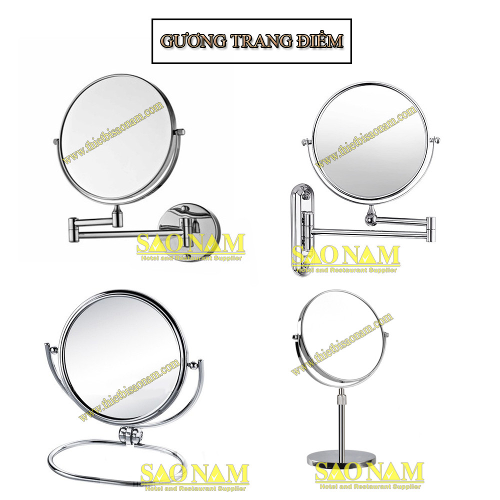 Đây là mẫu gương chuyên dụng cho việc trang điểm tỉ mỉ, với một mặt phẳng soi bình thường và một mặt phóng đại (thường từ 2x đến 5x hoặc cao hơn). Mặt phóng to giúp du khách dễ dàng quan sát các chi tiết nhỏ trên khuôn mặt như lông mày, mắt, môi, từ đó thực hiện các thao tác trang điểm phức tạp một cách chính xác nhất. Thiết kế 2 mặt có thể xoay linh hoạt, rất tiện lợi. Gương được làm từ chất liệu inox cao cấp, chống gỉ, bền đẹp.