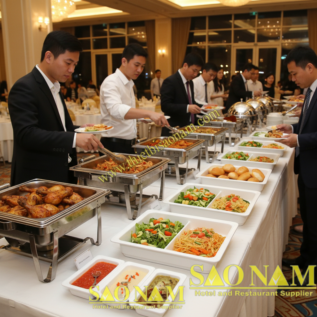 Đây là ứng dụng phổ biến nhất. Khay sứ được đặt trong các nồi hâm (chafing dish) để giữ nóng món ăn. Khay 1/1 dùng cho món chính, khay 1/2 cho món phụ, khay 1/3 cho nước sốt. Vẻ đẹp của sứ trắng làm nổi bật màu sắc món ăn, thu hút thực khách.