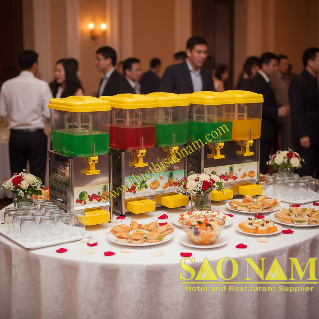 Những chiếc máy với thùng nhựa trong suốt chứa đầy nước ép màu sắc bắt mắt (cam vàng tươi, táo xanh nhạt, dưa hấu đỏ…) tự thân đã là một điểm nhấn trang trí tuyệt vời. Ánh đèn buffet phản chiếu qua lớp nước trong veo, kết hợp với vỏ inox sáng bóng tạo nên vẻ đẹp sang trọng, hấp dẫn, kích thích thị giác và khơi gợi cảm giác thèm uống nơi thực khách.