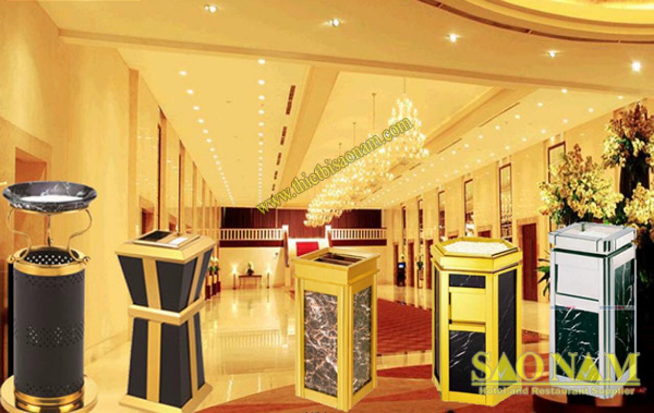 Khách sạn 5 sao, resort hạng sang: Nên chọn thùng rác có khung inox 304 mạ vàng, bốn mặt ốp đá hoa cương tự nhiên cao cấp.